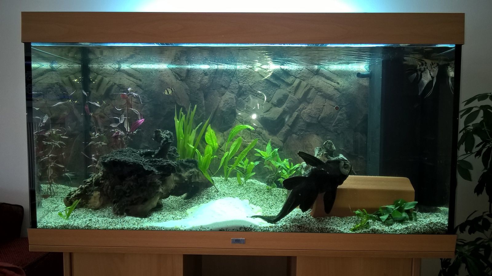 Völlig panisch kaufte ich noch am Freitagabend ein 100-Liter-Notaquarium mit allem Zubehör, trug es mit meiner Nachbarin in den 4. Stock und baute es auf. Ich ließ Wasser ein, setzte die Pumpe in Gang und packte ein paar Wurzeln hinein. Dann setzte ich die Fische um und leerte danach das leckende Aquarium.